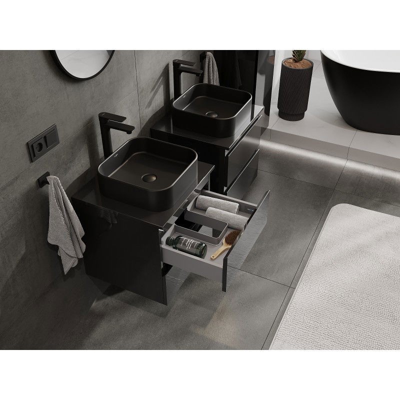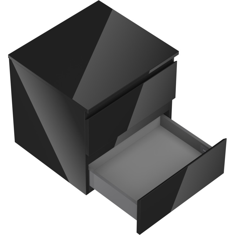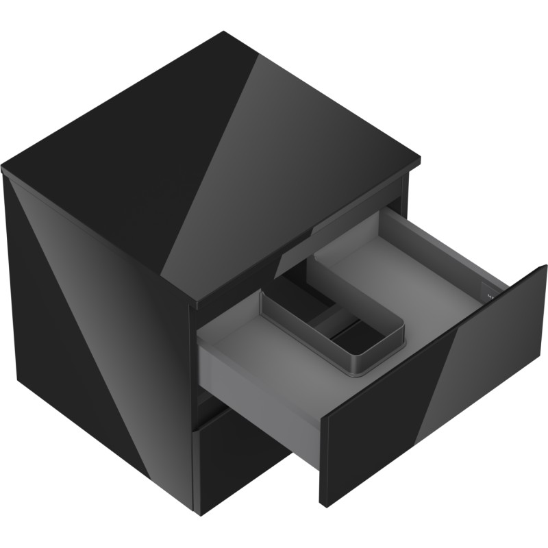 Specifikace produktu: Rozměry skříňky: Šířka: 50 cm Výška: 47 cm Hloubka: 46 cm Barva korpusu: Lesklá černá Materiál korpusu: Lakovaná deska Barva čela: Lesklá černá Materiál čela: Lakovaná MDF deska Struktura čela: Hladká Počet zásuvek: 2 Prostorná zásuvka s funkcí tichého dovírání Plný výsuv pro snadný přístup k obsahu zásuvky Povrch odolný vůči UV záření Rozměry pracovní desky: Šířka: 50,6 cm Hloubka: 46,5 cm Tloušťka: 1,8 cm Barva pracovní desky: Lesklá černá Materiál pracovní desky: Lakovaná MDF deska Povrch odolný vůči UV záření Ideální jako podstavec pro umyvadla na desku Sestavený produkt