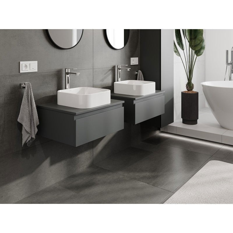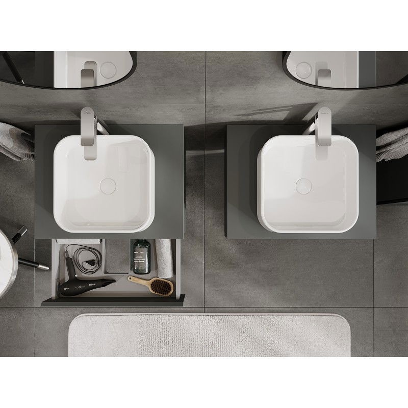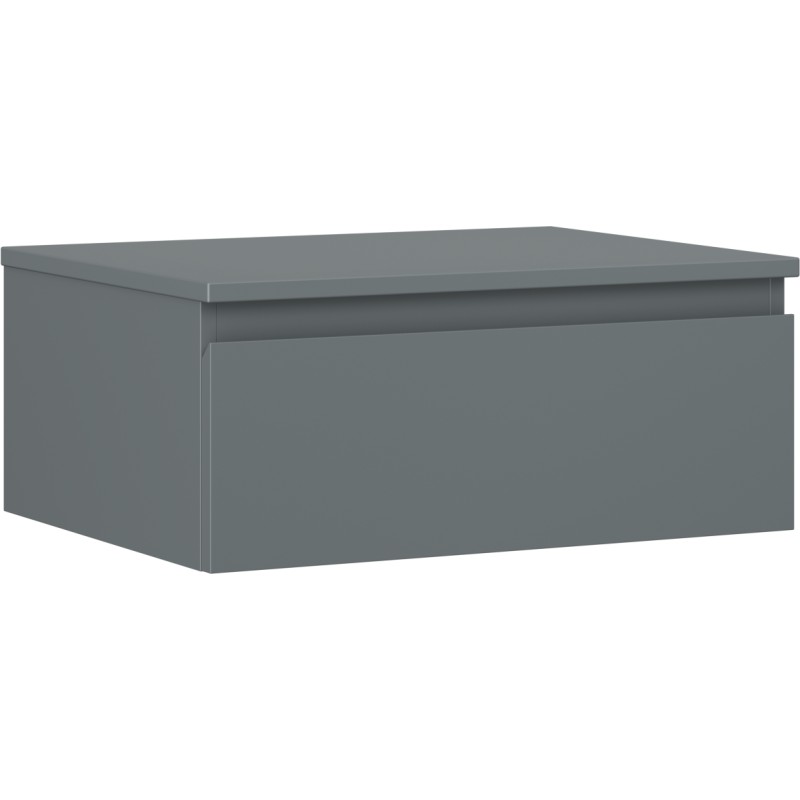 Specifikace produktu: Rozměry skříňky: Šířka: 60 cm Výška: 23,5 cm Hloubka: 46 cm Barva korpusu: Matný grafit Materiál korpusu: Lakovaná deska Barva čela: Matný grafit Materiál čela: Lakovaná MDF deska Struktura čela: Hladká Počet zásuvek: 1 Prostorná zásuvka s funkcí tlumeného dovírání Plný výsuv pro snadný přístup k obsahu zásuvky Povrch odolný vůči UV záření Rozměry pracovní desky: Šířka: 60,6 cm Hloubka: 46,5 cm Tloušťka: 1,8 cm Barva pracovní desky: Matný grafit Materiál pracovní desky: Lakovaná MDF deska Povrch odolný vůči UV záření Ideální jako podstavec pro umyvadla na desku Sestavený produkt