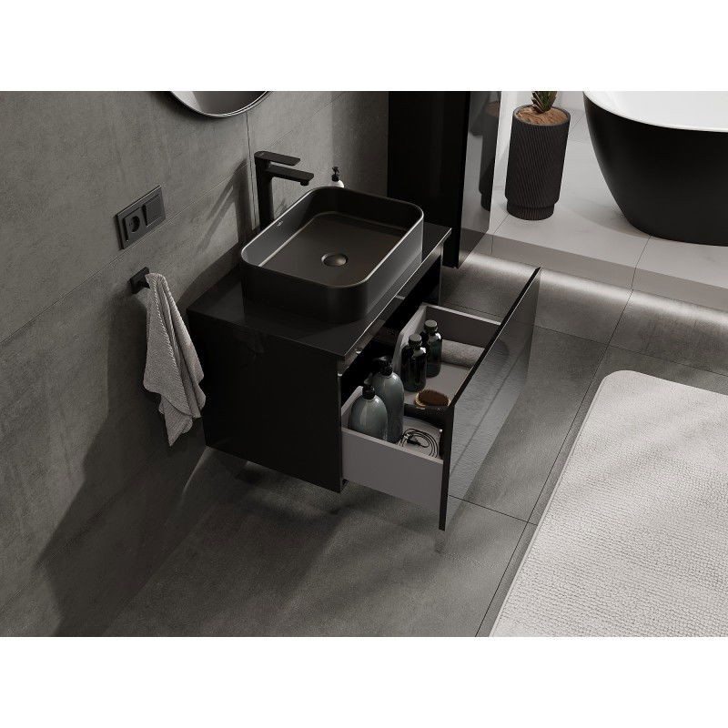 Specifikace produktu: Rozměry skříňky: Šířka: 70 cm Výška: 47 cm Hloubka: 46 cm Barva korpusu: Lesklá černá Materiál korpusu: Lakovaná deska Barva čela: Lesklá černá Materiál čela: Lakovaná MDF deska Struktura čela: Hladká Počet zásuvek: 1 Prostorná zásuvka s funkcí tichého dovírání Plný výsuv pro snadný přístup k obsahu zásuvky Povrch odolný vůči UV záření Rozměry pracovní desky: Šířka: 70,6 cm Hloubka: 46,5 cm Tloušťka: 1,8 cm Barva pracovní desky: Lesklá černá Materiál pracovní desky: Lakovaná MDF deska Povrch odolný vůči UV záření Ideální jako podstavec pro umyvadla na desku Sestavený produkt