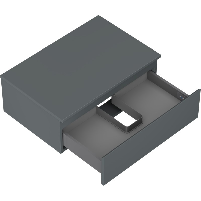 Specifikace produktu: Rozměry skříňky: Šířka: 70 cm Výška: 23,5 cm Hloubka: 46 cm Barva korpusu: Matný grafit Materiál korpusu: Lakovaná deska Barva čela: Matný grafit Materiál čela: Lakovaná MDF deska Struktura čela: Hladká Počet zásuvek: 1 Prostorná zásuvka s funkcí tlumeného dovírání Plný výsuv pro snadný přístup k obsahu zásuvky Povrch odolný vůči UV záření Rozměry pracovní desky: Šířka: 70,6 cm Hloubka: 46,5 cm Tloušťka: 1,8 cm Barva pracovní desky: Matný grafit Materiál pracovní desky: Lakovaná MDF deska Povrch odolný vůči UV záření Ideální jako podstavec pro umyvadla na desku Sestavený produkt