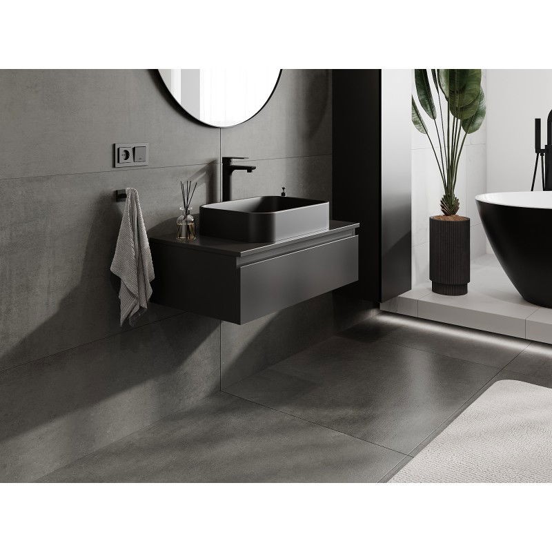 Specifikace produktu: Rozměry skříňky: Šířka: 80 cm Výška: 23,5 cm Hloubka: 46 cm Barva korpusu: Matná černá Materiál korpusu: Lakovaná deska Barva čela: Matná černá Materiál čela: Lakovaná MDF deska Struktura čela: Hladká Počet zásuvek: 1 Prostorná zásuvka s funkcí tlumeného dovírání Plný výsuv pro snadný přístup k obsahu zásuvky Povrch odolný vůči UV záření Rozměry pracovní desky: Šířka: 80,6 cm Hloubka: 46,5 cm Tloušťka: 1,8 cm Barva pracovní desky: Matná černá Materiál pracovní desky: Lakovaná MDF deska Povrch odolný vůči UV záření Ideální jako podstavec pro umyvadla na desku Sestavený produkt