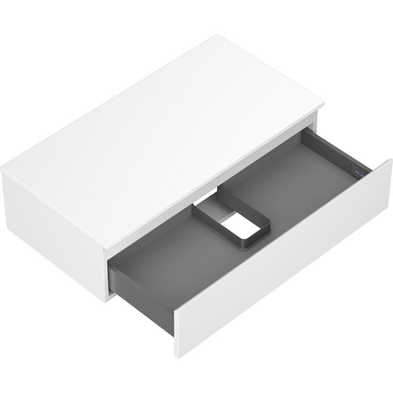 Specifikace produktu: Rozměry skříňky: Šířka: 90 cm Výška: 23,5 cm Hloubka: 46 cm Barva korpusu: Matná bílá Materiál korpusu: Lakovaná deska Barva čela: Matná bílá Materiál čela: Lakovaná MDF deska Struktura čela: Hladká Počet zásuvek: 1 Prostorná zásuvka s funkcí tlumeného dovírání Plný výsuv pro snadný přístup k obsahu zásuvky Povrch odolný vůči UV záření Rozměry pracovní desky: Šířka: 90,6 cm Hloubka: 46,5 cm Tloušťka: 1,8 cm Barva pracovní desky: Matná bílá Materiál pracovní desky: Lakovaná MDF deska Povrch odolný vůči UV záření Ideální jako podstavec pro umyvadla na desku Sestavený produkt