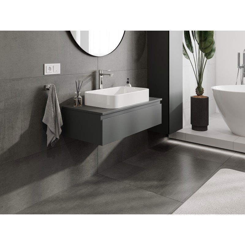 Specifikace produktu: Rozměry skříňky: Šířka: 90 cm Výška: 23,5 cm Hloubka: 46 cm Barva korpusu: Matný grafit Materiál korpusu: Lakovaná deska Barva čela: Matný grafit Materiál čela: Lakovaná MDF deska Struktura čela: Hladká Počet zásuvek: 1 Prostorná zásuvka s funkcí tlumeného dovírání Plný výsuv pro snadný přístup k obsahu zásuvky Povrch odolný vůči UV záření Rozměry pracovní desky: Šířka: 90,6 cm Hloubka: 46,5 cm Tloušťka: 1,8 cm Barva pracovní desky: Matný grafit Materiál pracovní desky: Lakovaná MDF deska Povrch odolný vůči UV záření Ideální jako podstavec pro umyvadla na desku Sestavený produkt