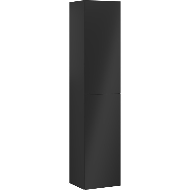 Specifikace produktu: Šířka: 35 cm Výška: 160 cm Hloubka: 30 cm Barva korpusu: Matná černá Materiál korpusu: Lakovaná deska Barva čela: Matná černá Materiál čela: Lakovaná MDF deska Konstrukce čela: Hladká Počet dvířek: 2 5 polic (1 pevná prostřední police a 4 nastavitelné police) Panty s funkcí tlumeného dovírání Univerzální montáž dvířek (levé/pravé) Povrch odolný vůči UV záření Produkt smontovaný