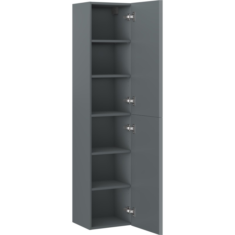 Specifikace produktu: Šířka: 35 cm Výška: 160 cm Hloubka: 30 cm Barva korpusu: Matný grafit Materiál korpusu: Lakovaná deska Barva čela: Matný grafit Materiál čela: Lakovaná MDF deska Konstrukce čela: Hladká Počet dvířek: 2 5 polic (1 pevná prostřední police a 4 nastavitelné police) Panty s funkcí tlumeného dovírání Univerzální montáž dvířek (levé/pravé) Povrch odolný vůči UV záření Produkt smontovaný