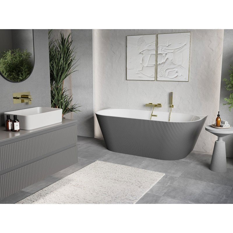 Specifikace produktu: Rozměry: 150 x 75 cm Výška: 58 cm Hloubka: 44 cm Montáž: Nástěnná Materiál: Sanitární akrylát Barva: Bílá/šedá Povrchová úprava: Zlatá Struktura: Drážkovaná Otvor pro přepad: Ano Otvor pro baterii: Ne Sifon a zátka click-clack jsou součástí dodávky Odolné vůči baterii, baterii a UV záření