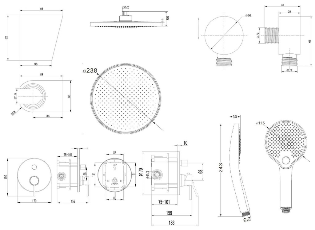 horní sprchu 238 mm se sprchovým ramenem 350 mm