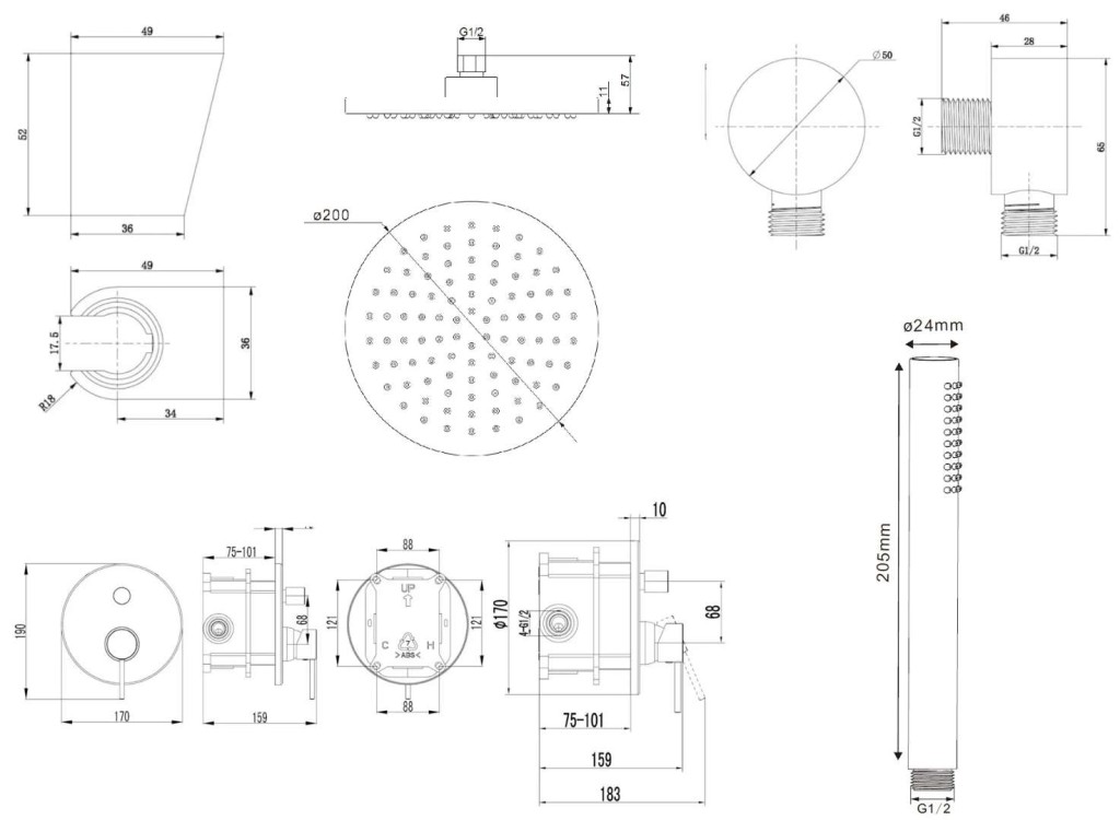 horní sprchu 200 mm se sprchovým ramenem 350 mm