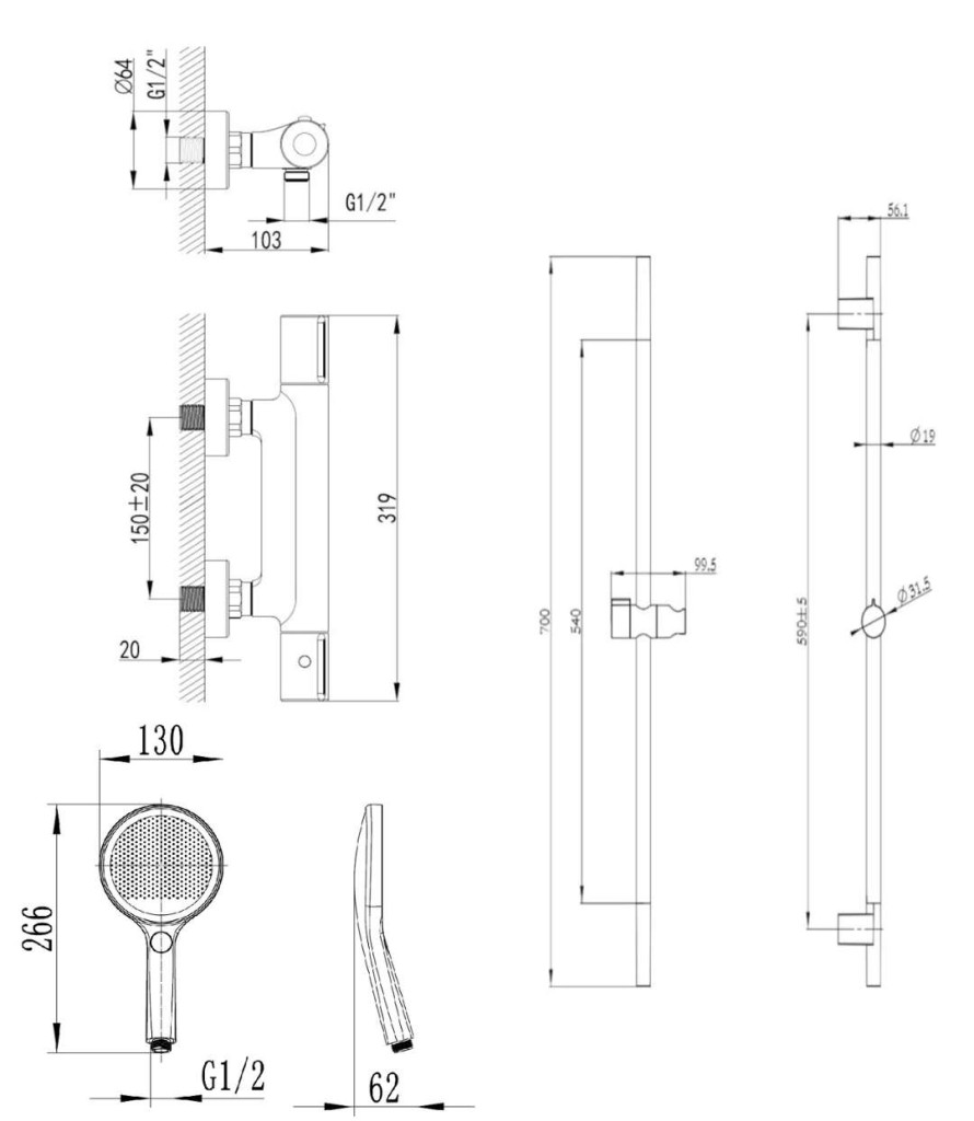 sprchovou tyč 700 mm