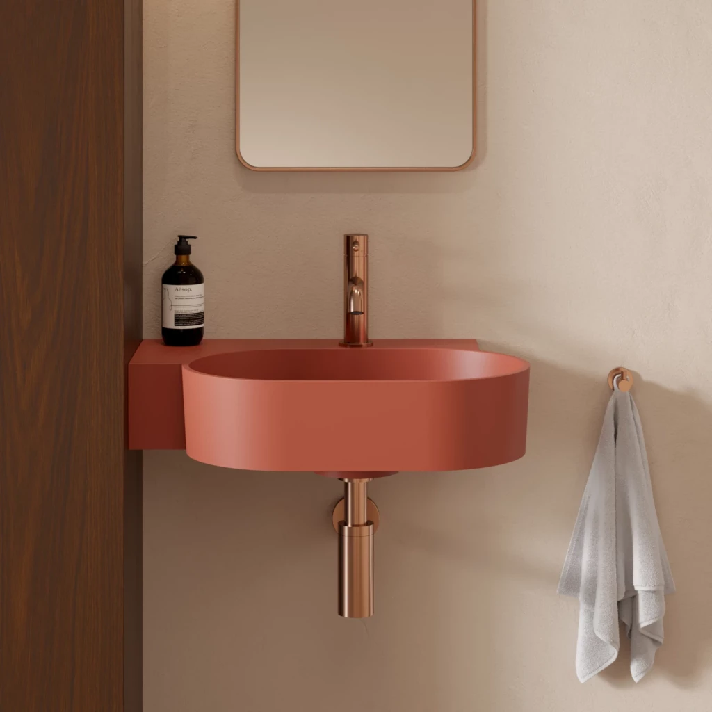 OVO v terakotové barvě (RAL8004) je umyvadlo v sofistikované cihlově červené barvě se sametově hebkým matným povrchem.