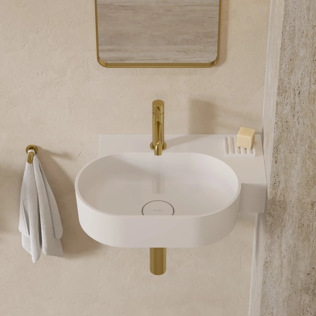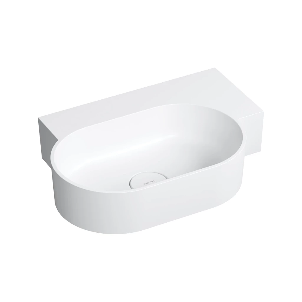 Umyvadlo z kolekce OMNIRES OVO se vyznačuje minimalistickým, expresivním tvarem s dokonalými proporcemi. Hravá geometrie vytváří oválnou mísu v kombinaci s funkční obdélníkovou poličkou – ideální místo pro montáž baterie, ale i pro uložení kosmetiky a dalších nezbytných doplňků. Harmonicky profilované stěny jsou zakončeny plochým okrajem, který zdůrazňuje tvar, zatímco perfektně padnoucí kryt odtoku zaručuje nejvyšší estetiku. Na spodní straně umyvadla je navrženo decentní, z výroby zastíněné místo, které označuje umístění otvoru pro baterii.