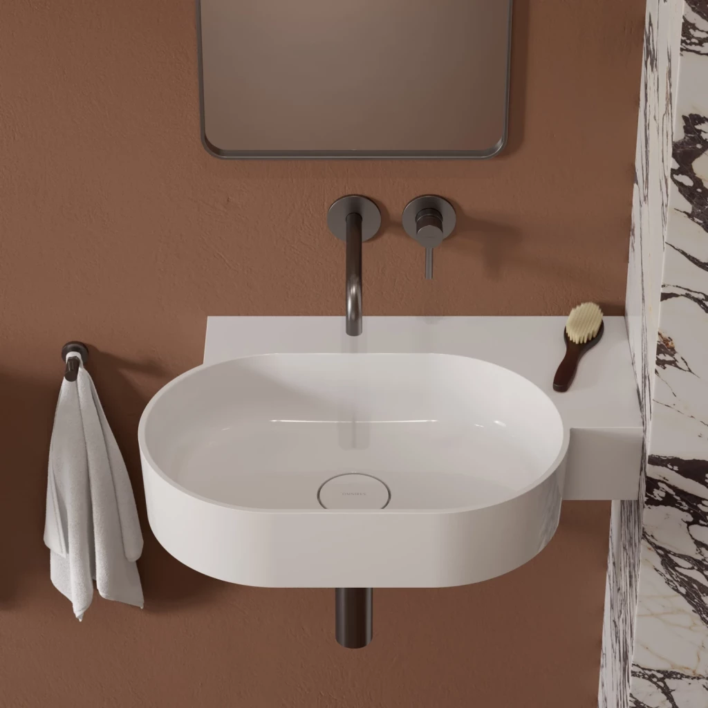 Umyvadlo z kolekce OMNIRES OVO se vyznačuje minimalistickým, expresivním tvarem s dokonalými proporcemi. Hravá geometrie vytváří oválnou mísu v kombinaci s funkční obdélníkovou poličkou – ideální místo pro montáž baterie, ale i pro uložení kosmetiky a dalších nezbytných doplňků. Harmonicky profilované stěny jsou zakončeny plochým okrajem, který zdůrazňuje tvar, zatímco perfektně padnoucí kryt odtoku zaručuje nejvyšší estetiku. Na spodní straně umyvadla je navrženo decentní, z výroby zastíněné místo, které označuje umístění otvoru pro baterii.
