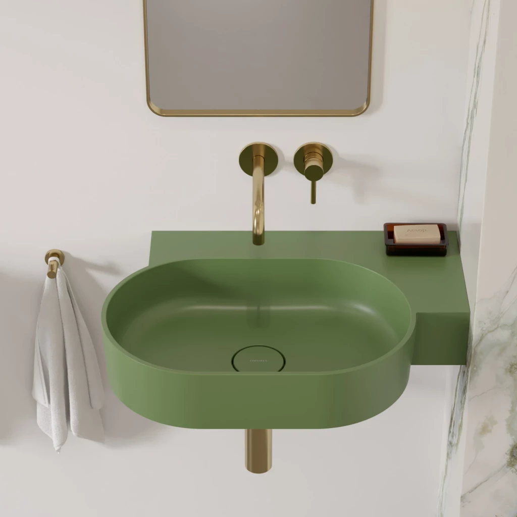 Umyvadlo z kolekce OMNIRES OVO se vyznačuje minimalistickým, expresivním tvarem s dokonalými proporcemi. Hravá geometrie vytváří oválnou mísu v kombinaci s funkční obdélníkovou poličkou – ideální místo pro montáž baterie, ale i pro uložení kosmetiky a dalších nezbytných doplňků. Harmonicky profilované stěny jsou zakončeny plochým okrajem, který zdůrazňuje tvar, zatímco perfektně padnoucí kryt odtoku zaručuje nejvyšší estetiku. Na spodní straně umyvadla je navrženo decentní, z výroby zastíněné místo, které označuje umístění otvoru pro baterii.