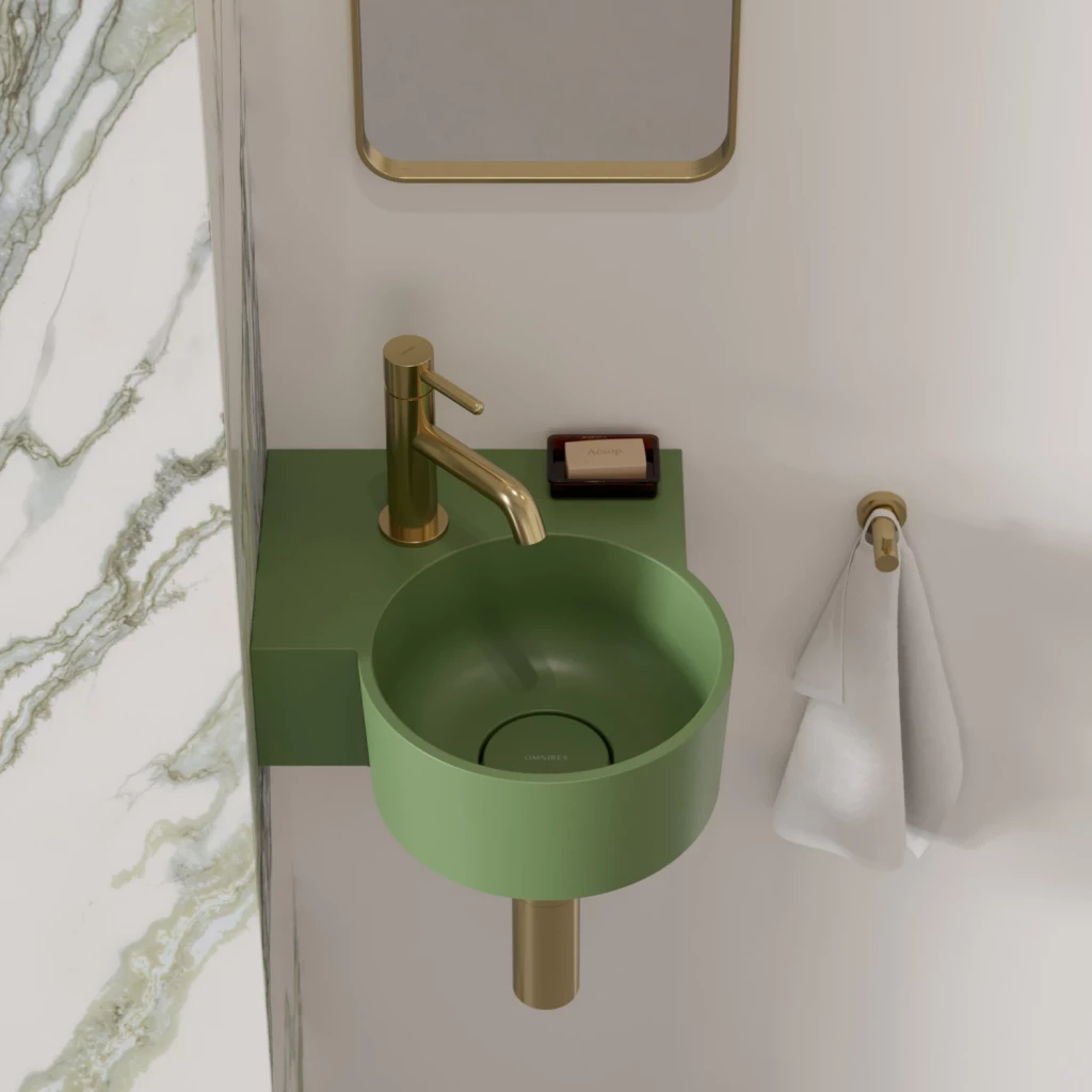 Umyvadlo z kolekce OMNIRES OVO se vyznačuje minimalistickým, expresivním tvarem s dokonalými proporcemi. Hravá geometrie vytváří kulatou mísu v kombinaci s funkční obdélníkovou poličkou – ideální místo pro montáž baterií, ale i pro uložení kosmetiky a dalších nezbytných doplňků. Harmonicky profilované stěny jsou zakončeny plochým okrajem, který zdůrazňuje tvar, zatímco perfektně padnoucí kryt odtoku zaručuje nejvyšší estetiku. Spodní strana umyvadla je zdobí decentní, z výroby vyznačené tečky, které označují místa pro vrtání baterií nebo dávkovačů, což umožňuje flexibilní přizpůsobení armatur individuálním potřebám.