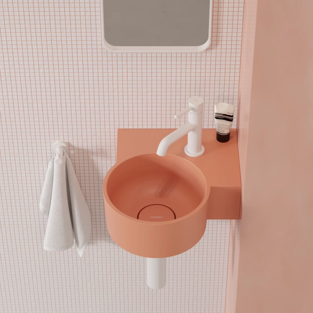 OVO v korálové barvě (RAL3012) je umyvadlo v decentním odstínu růžové se sametově hebkým matným povrchem.