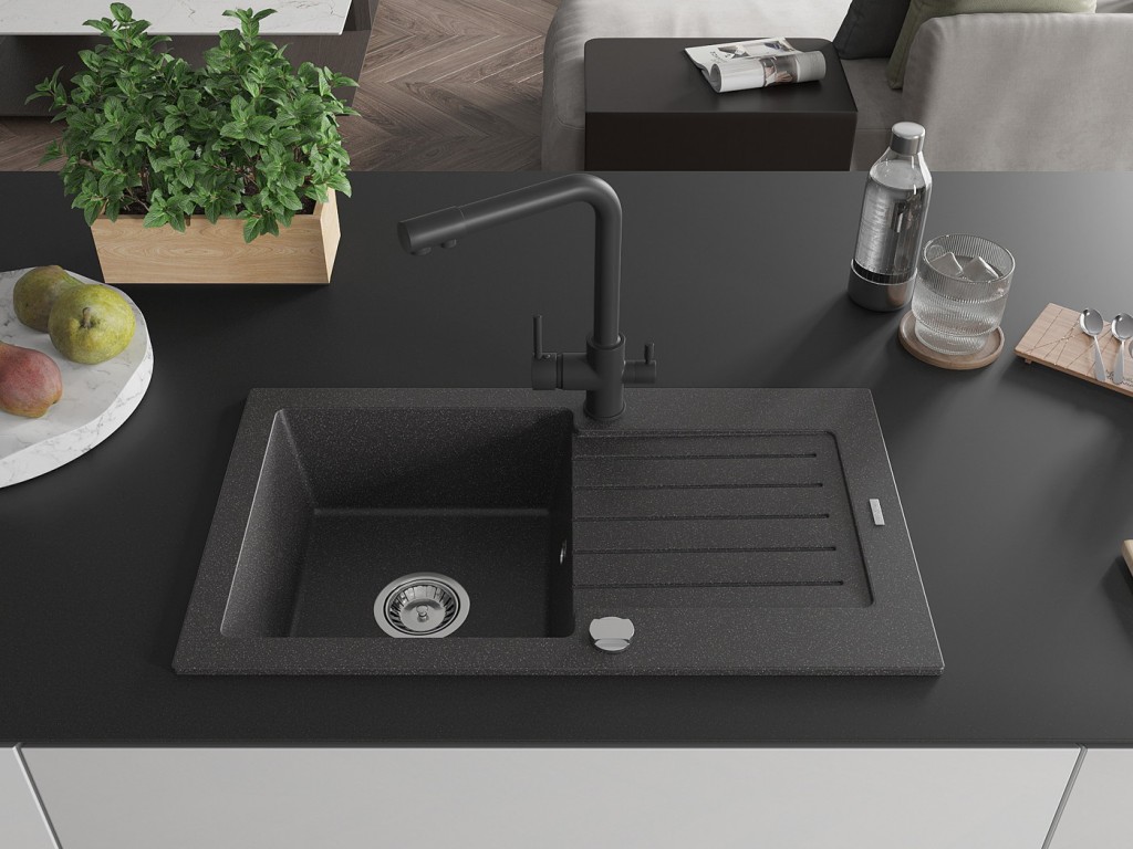 Speciální složení materiálu použitého pro výrobu je žula (80% žula – kámen, 20% pryskyřice) a jeho vysoká hustota garantuje bezpečné používání výrobku, a proto jsou granitové dřezy tak oblíbené. Díky povrchové úpravě nejsou na granitovém dřezu vidět zaschlé kapky, je odolný vůči skvrnám a neztrácí barvu. Povrch je odolný vůči nárazu, poškrábání, změně barvy, vysoké teplotě a teplotním šokům. Při jejich údržbě se používají obvyklé čistící prostředky nebo prostředky na nádobí s jemným abrasivem. Výhodou je rozmanitá barevná nabídka.