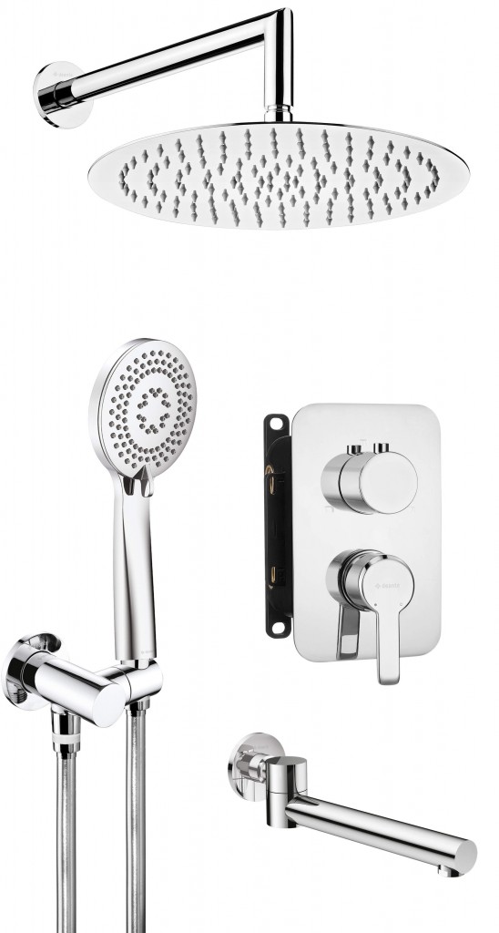 Sprchový set pod omítku má všechny potřebné prvky k vybavení sprchy. Vysoká kvalita použitých materiálů mnohokrát testovaných v laboratorních podmínkách zajišťuje bezporuchový provoz. Inovativní design a elegantní povrchová úprava upoutá pozornost a zapuštěná instalace opticky zvětšuje prostor. Tradiční řešení umožňuje získat prostor například pro přídavnou polici na kosmetiku nebo věšák. Díky tomu můžete snáze a rychleji uklidit celou místnost. Jedná se o model s vanovým výtokem.