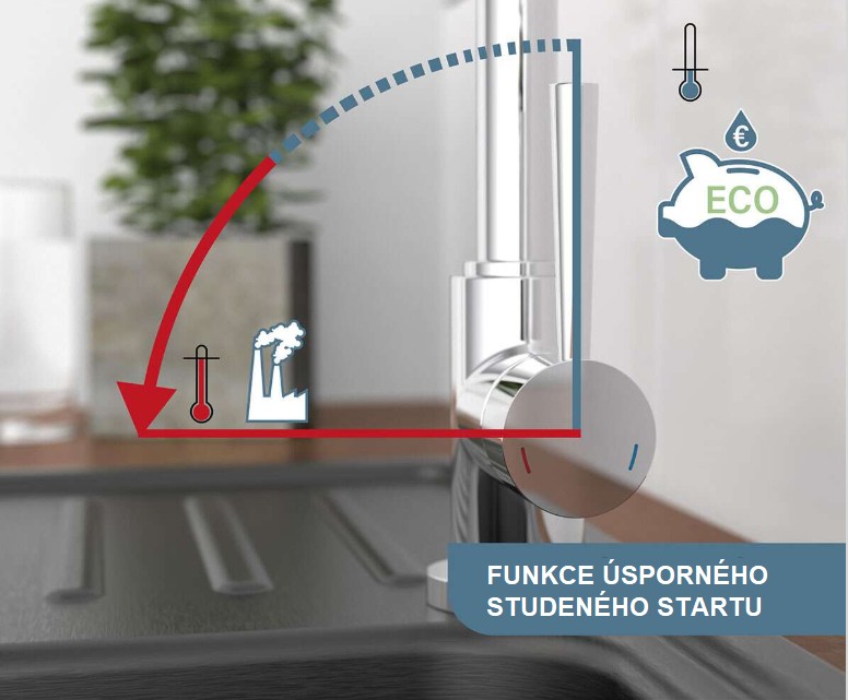 Praktická funkce studeného startu – šetří energii tím, že při spuštění teče pouze studená voda.