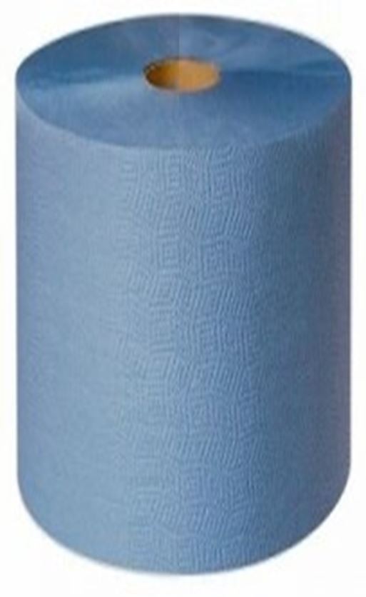 Papírové utěrky modrá role, 3-vrstvé, perforované plošně ražené. Používají se pro autolakovny, tiskárny, podlahové stojany nebo stěnové držáky spolu s odpadními pytli.
