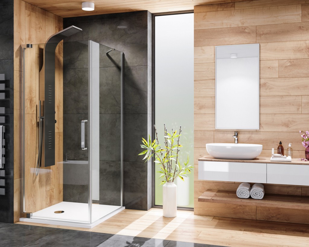Sprchový kout čtvercový s jedněmi otevíracími dveřmi, kalené sklo s antiplaková povrchovou úpravou proti usazování vodního kamene - TEKNO.CAL.