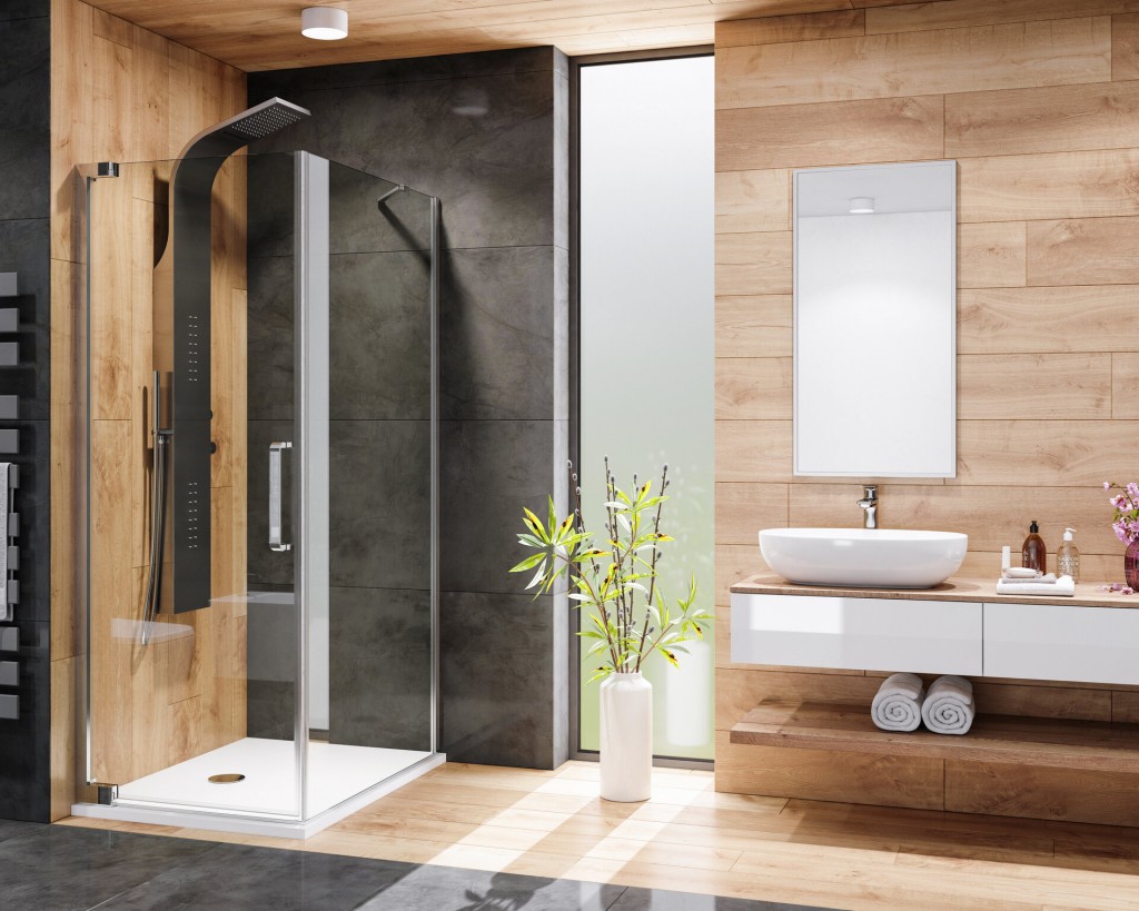 Sprchový kout obdélníkový s jedněmi otevíracími dveřmi, kalené sklo s antiplaková povrchovou úpravou proti usazování vodního kamene - TEKNO.CAL.