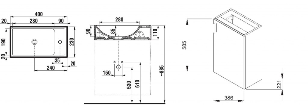 Skříňka s umývátkem bez přepadu, s otvorem pro baterii
