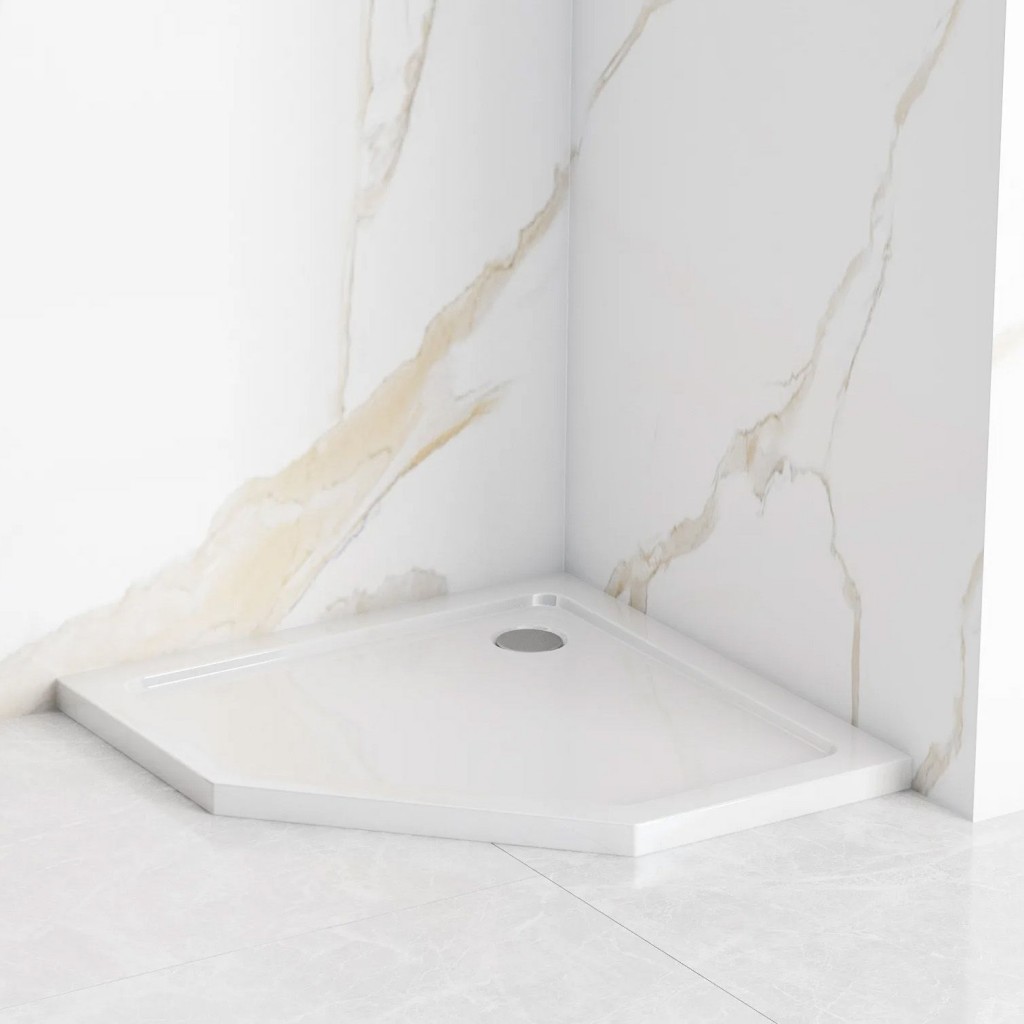 Bílá vanička ve tvaru diamantu je ideálním řešením pro rohové sprchové kouty. Poskytuje dostatek prostoru pro pohodlnou koupel, a zároveň svým zkosením efektivně využívá prostor. Hodí se do všech koupelen, které mají vývod na odpad v zadním rohu.
