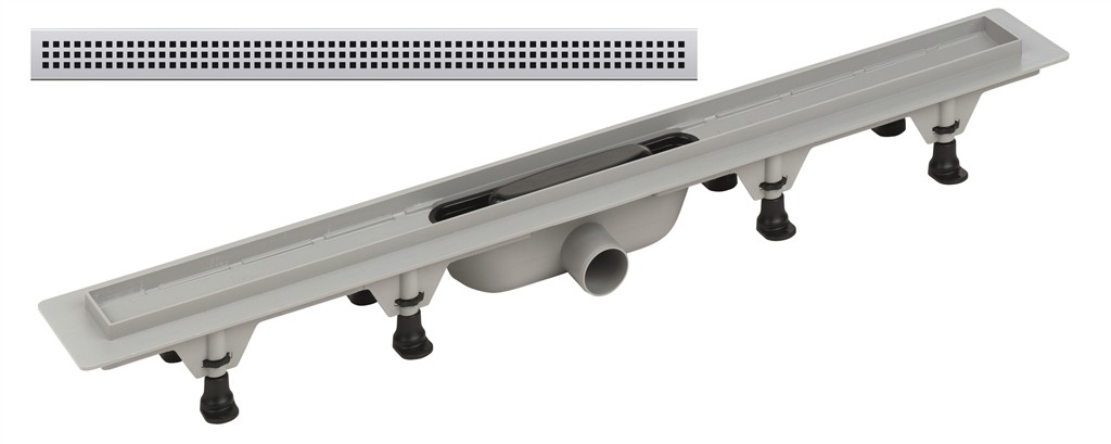 Obsah balení: žlab s roštem, sifon, butylenový pás pro napojení hydroizolace, stavitelné nohy, klíč pro vyjímání roštu.