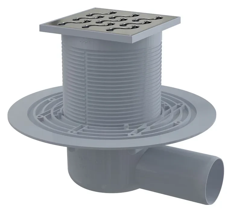 Podlahová vpust 105 × 105/50 boční, mřížka nerez, vodní zápachová uzávěra