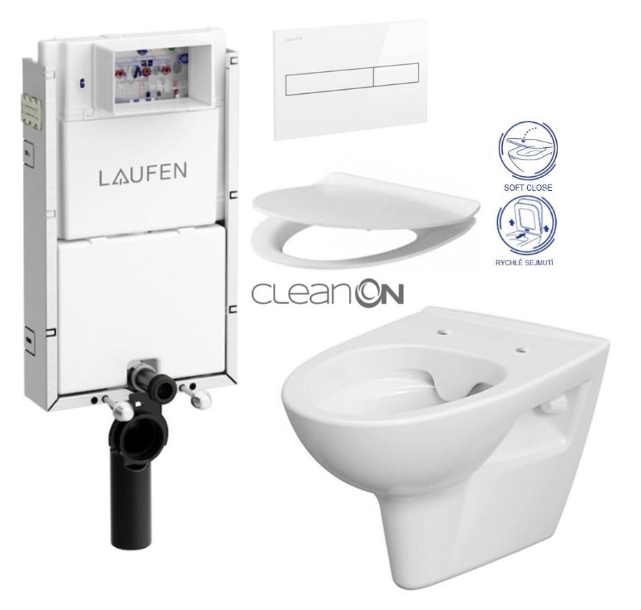 Závěsná mísa PARVA Clean ON elegantního vzhledu s horizontálním odpadem. Funkce splachování 2,5/5, 3/5l.