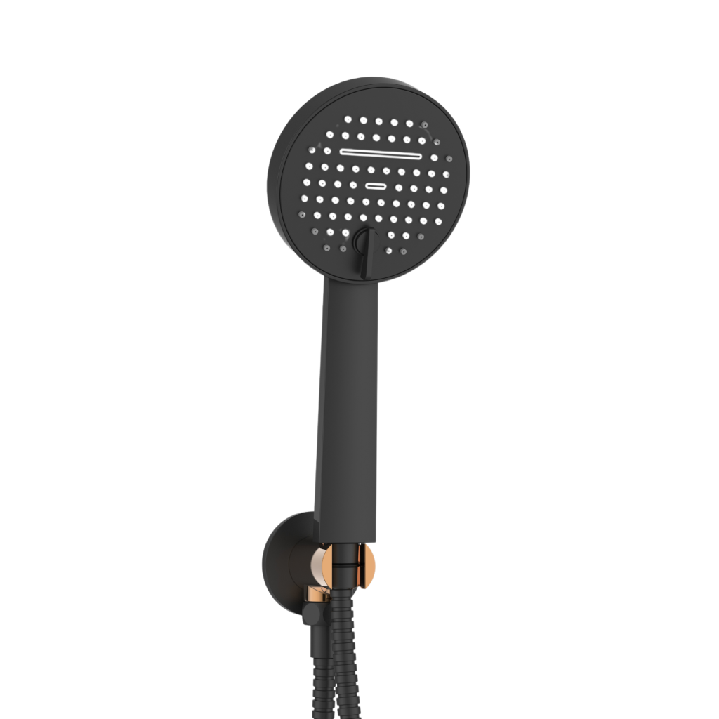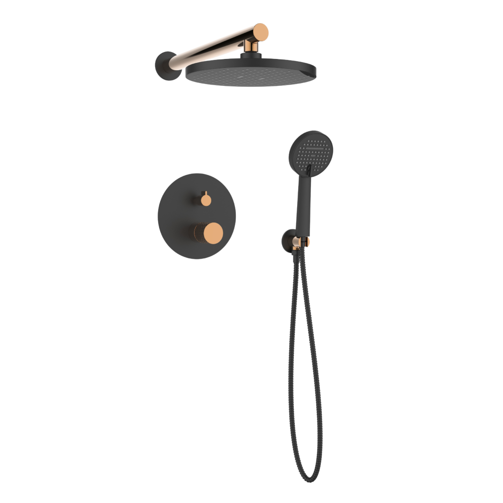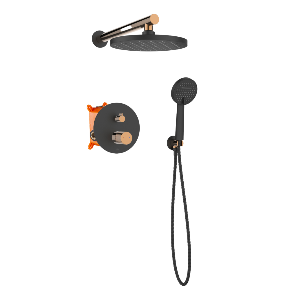 Objevte jedinečnou sprchovou sadu pod omítku řady Moonlight, která kombinuje moderní funkčnost s luxusním designem. Tato sada se perfektně hodí pro vytvoření elegantní koupelny a vyznačuje se kombinací tmavě černé barvy se sofistikovanými růžovo-zlatými akcenty, které jí dodávají jedinečný a stylový charakter. Klíčové vlastnosti: Horní sprchová hlavice: Kulatá, o průměru 22,5 cm, vybavená pokročilým provzdušňovacím systémem. Poskytuje rovnoměrný proud bez ohledu na kolísání tlaku, zatímco systém proti vodnímu kameni chrání před usazováním vodního kamene. Sprchové rameno: Elegantní a robustní, dlouhé 40 cm, dokonale doplňuje zbytek sady. Podomítková sprchová baterie: Dvojí funkce, umožňuje snadné přepínání mezi dešťovou sprchovou hlavicí a ruční sprchou. Ruční sprcha: Dvojí funkce (normální proud, kaskáda), průměr 10,5 cm, s systémem proti vodnímu kameni a provzdušňovacím systémem, díky čemuž je snadno čistitelná a ekologická. Sprchová hadice: Vyrobena z dvojitě opletené nerezové oceli, dlouhá 150 cm, zajišťuje odolnost a spolehlivost. Úhlová spojka s držákem ruční sprchy: Kulatá, funkční a esteticky příjemná, dokonale doplňuje celou sadu. Montážní krabice: Součástí balení je pro snadnou a pohodlnou instalaci. Sprchová sada Moonlight není jen technologicky vyspělým řešením, ale také estetickým uměleckým dílem, které podtrhne jedinečný charakter vaší koupelny. Investujte do kvality, stylu a funkčnosti, které vám vydrží po mnoho let.