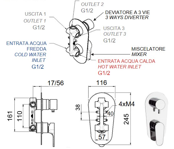 - Sprchová baterie podomítková, bez příslušenství, s přepínačem, 3 výstupy