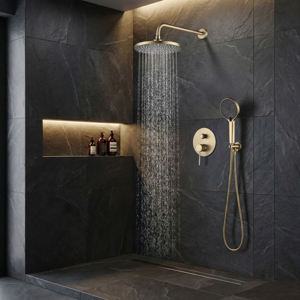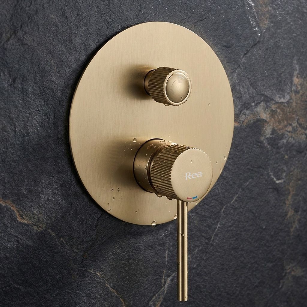 Podomítková sprchová sada Rea Lungo Stripe v barvě broušeného zlata je moderní řešení navržené pro uživatele, kteří očekávají spolehlivost a elegantní vzhled. Teplý odstín zlata v kombinaci s jemným broušením a výrazným rýhováním detailů dodává koupelně prestižní a luxusní charakter.Dekorativní rýhování Stripe – charakteristické drážky na ovladačích baterie jsou stylovým detailem, který přitahuje pozornost a zajišťuje pevný úchop při ovládání proudu vody mokrou rukou.Moderní podomítkový systém BOX – estetická instalace umožňuje skrýt připojení ve stěně. Inovativní kazeta (Box) usnadňuje montáž a zajišťuje pohodlný servisní přístup v budoucnu bez nutnosti sekání obkladů.Povrch v barvě broušeného zlata – odolný matný povrch účinně maskuje otisky prstů a dodává interiéru eleganci a styl. Perfektně ladí s dalšími prvky série Lungo.Hlavová sprcha se širokým proudem – plochá kulatá hlavice na nástěnném rameni zajišťuje rovnoměrný a relaxační proud vody. Součástí sady je také praktická ruční sprcha s flexibilní hadicí.Odolné materiály – sada je vyrobena z vysoce kvalitní mosazi a odolných materiálů, což zaručuje plnou odolnost vůči vlhkosti a korozi a dlouhou životnost.Systém Anti-Calc – silikonové trysky ve sprše a ruční hlavici zabraňují usazování vodního kamene a výrazně usnadňují čištění.Výběrem kompletní sprchové sady Lungo Stripe se systémem Box investujete do chytrého řešení spojujícího špičkovou estetiku, bezpečnost a komfort. Minimalistický tvar a rýhované detaily dokonale doplní každou stylovou koupelnovou zónu.