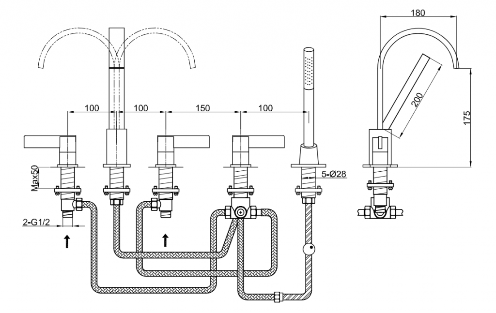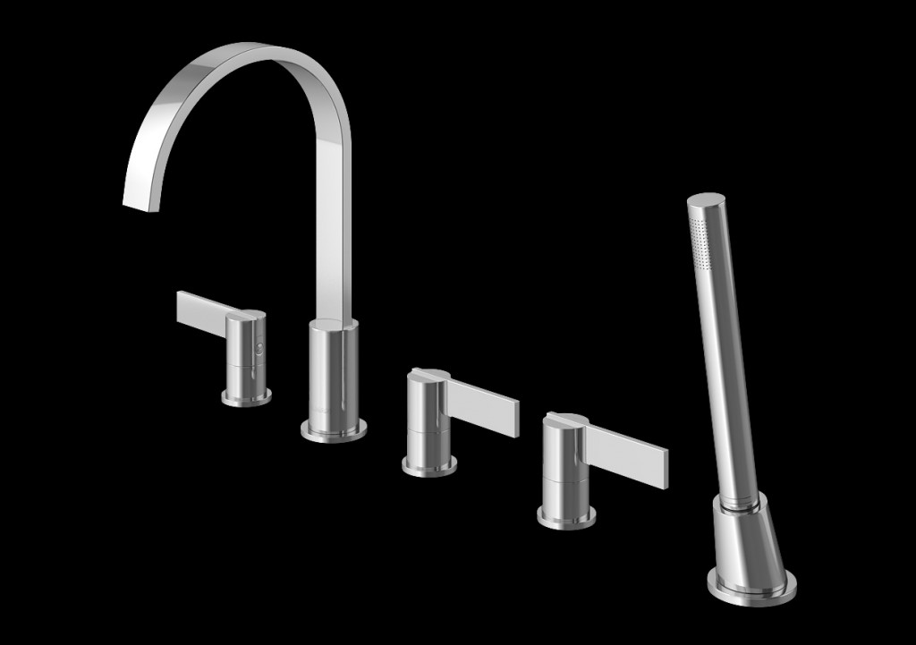 5-otvorová vanová baterie série DEXAME je vyrobena z mosazi a opatřena keramickou kartuší. Je to typ vodovodní baterie, která se používá pro instalaci přímo na okraji vany nebo na obkladový pult vedle vany a vyžaduje pět otvorů. Tato baterie má pět komponentů - výtokovou hubici, kterou teče voda do vany, dvě samostatné páky pro regulaci teplé a studené vody, přepínač a ruční sprchu s hadicí dlouhou 1,5 m. Tento typ baterie poskytuje elegantní a moderní vzhled.