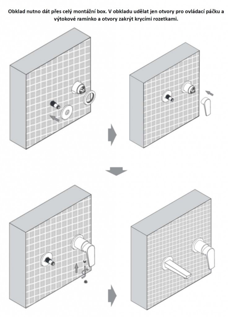 Dodáváno včetně podomítkového modulu.Dodáváno včetně podomítkového modulu. U tohoto typu baterie je nutno obklad dát přes celý již osazený montážní modul. V obkladu udělat jen otvory pro ovládací páčku a výtokové ramínko a otvory zakrýt přiloženými krycími rozetkami.