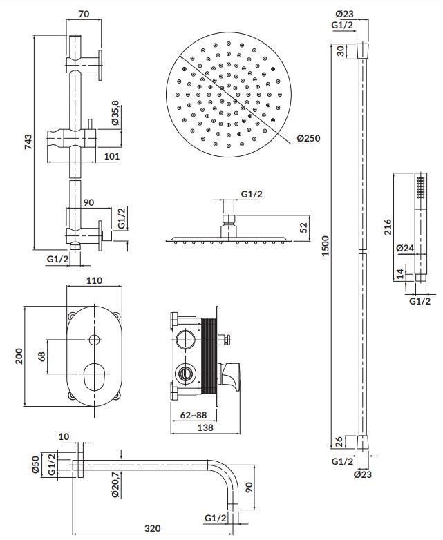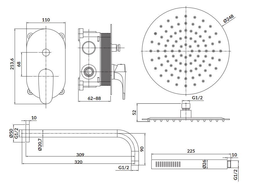 Moderní styl podomítkové sady INVERTO bude perfektním řešením pro vaší koupelnu. Sada INVERTO obsahuje: sprchovou pákovou baterii, sprchovou hlavici SLIM (0,2 cm) o průměru 25 cm z nerezové oceli se silikonovou povrchovou úpravou Cersanit EasyCLEAN, 1funkční ruční sprchu o průměru 2,4 cm, sprchovou hadici z PVC o délce 150 cm (schválení WRAS) a tyč s posuvným držákem (nerezová ocel), 75 cm dlouhá.