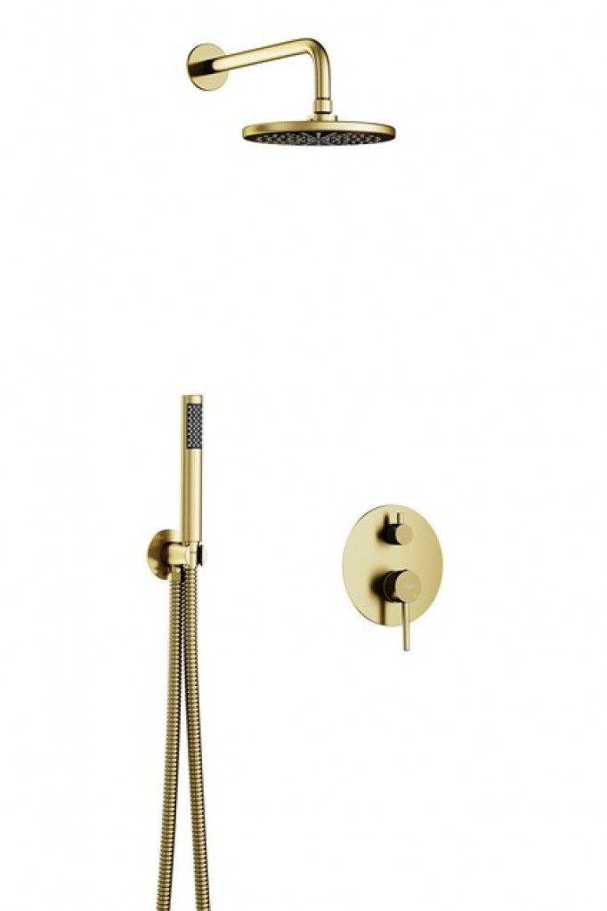 Jedinečný podomítkový set s příslušenstvím DECCO/ILLUSION I/VEO zlatá broušená barva. Kompletní řešení pro váš sprchový kout. Set obsahuje podomítkovou baterii, hlavovou sprchu s držákem, vývod ze stěny s držákem, ruční sprchu a hadici. Baterie je dodávána včetně podomítkového modulu, ten výrazně usnadňuje montáž. Dodáváme v šesti barvách a to lesklý chrom, černá, grafitová, zlatá, zlatá lesklá, zlatá broušená.