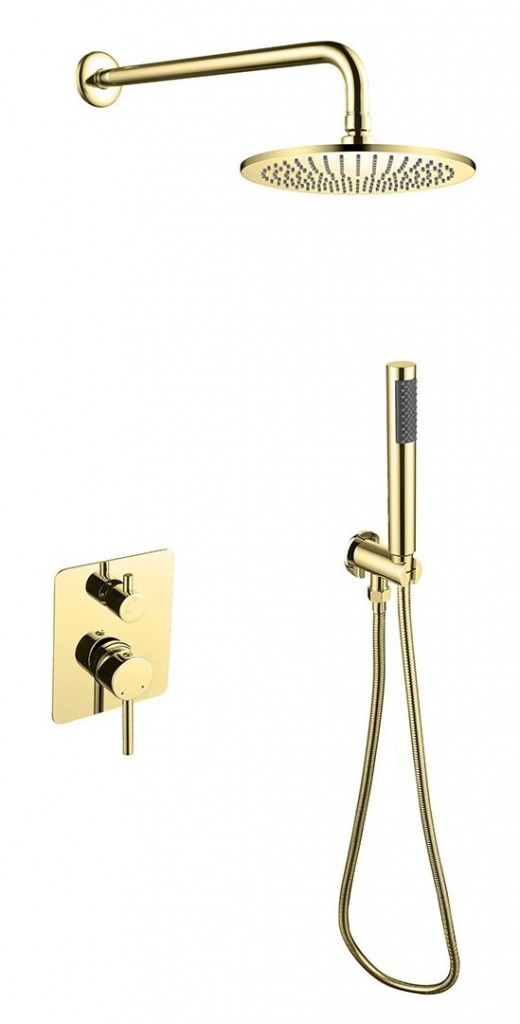 Jedinečný podomítkový set s příslušenství SLIM DECCO/ILLUSION II zlatá barva. Kompletní řešení pro váš sprchový kout. Set obsahuje podomítkovou baterii, hlavovou sprchu s držákem, vývod ze stěny s držákem, ruční sprchu a hadici. Baterie je dodávána včetně podomítkového modulu, ten výrazně usnadňuje montáž. Dodáváme v šesti barvách a to lesklý chrom, černá, grafitová, zlatá, zlatá lesklá, zlatá broušená.