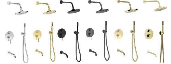 - Set obsahuje podomítkovou baterii, vývod ze stěny s držákem, včetně ruční sprchy a hadice, dále držák a kulatou hlavovou sprchu a stěnový vývod