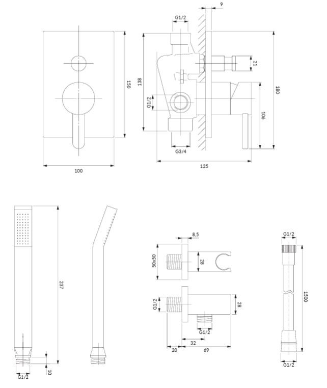 - mosazná úhlová spojka (8876GL), s držákem na rukojeť sprchy
