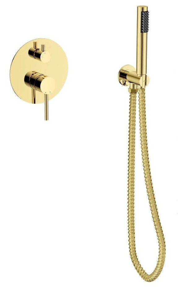 Jedinečný sprchový/vanový podomítkový set s příslušenstvím VEO ve zlaté barvě. Kompletní řešení pro vaši vanu. Set obsahuje podomítkovou baterii, vývod ze stěny s držákem, ruční sprchu a hadici. Baterie je dodávána včetně podomítkového modulu, ten výrazně usnadňuje montáž. Dodáváme v pěti barvách chrom, černá, grafitová, zlatá a zlatá jasná.