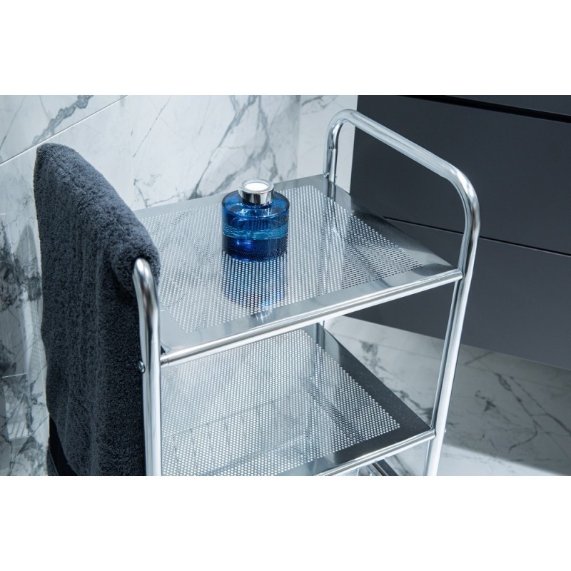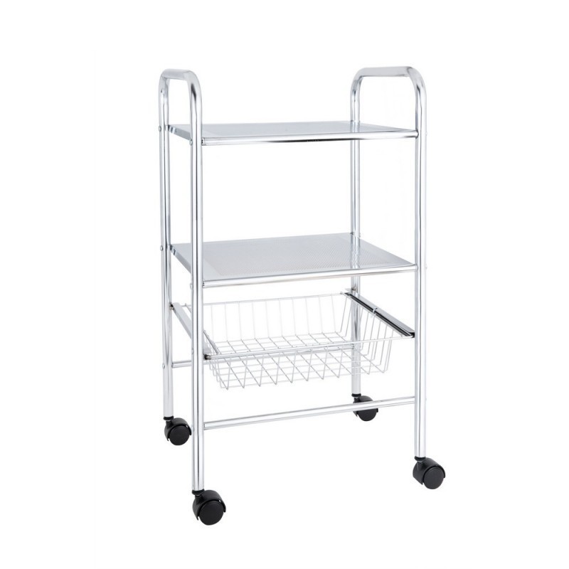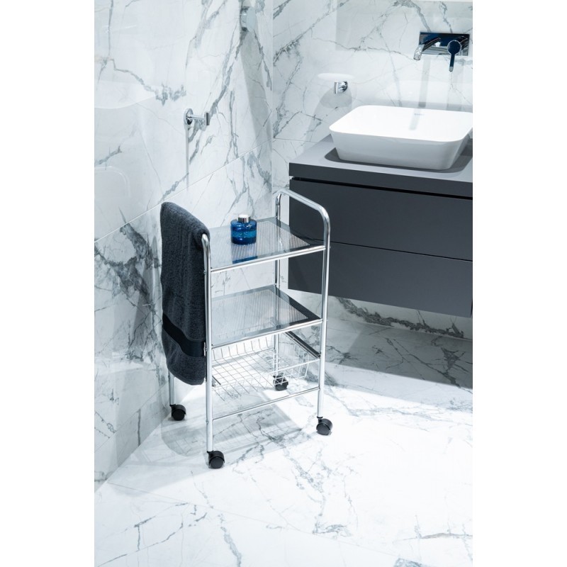 Třípatrový pojízdný vozík do koupelny KDD02040022. Praktický doplněk do koupelny má dvě poličky a na košík ve spodní části. Mějte své doplňky vždy po ruce. Konstrukce s kolečky usnadňuje úklid okolo koše. Pojízdné vozíky jsou vhodné pro použití i mimo koupelny a skvěle odolné vůči vlhkosti.