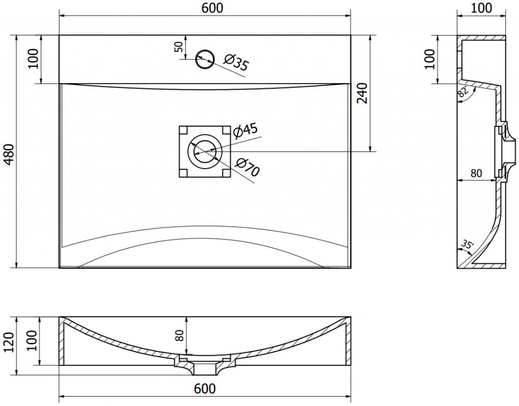 Samotné umyvadlo na desku je dlouhé 60 cm, hluboké 48 cm a vysoké 10 cm. Umyvadlo nemá bezpečnostní přepad, jen otvor pro baterii. Proto je vhodné kombinovat s nízkou umyvadlovou baterií.