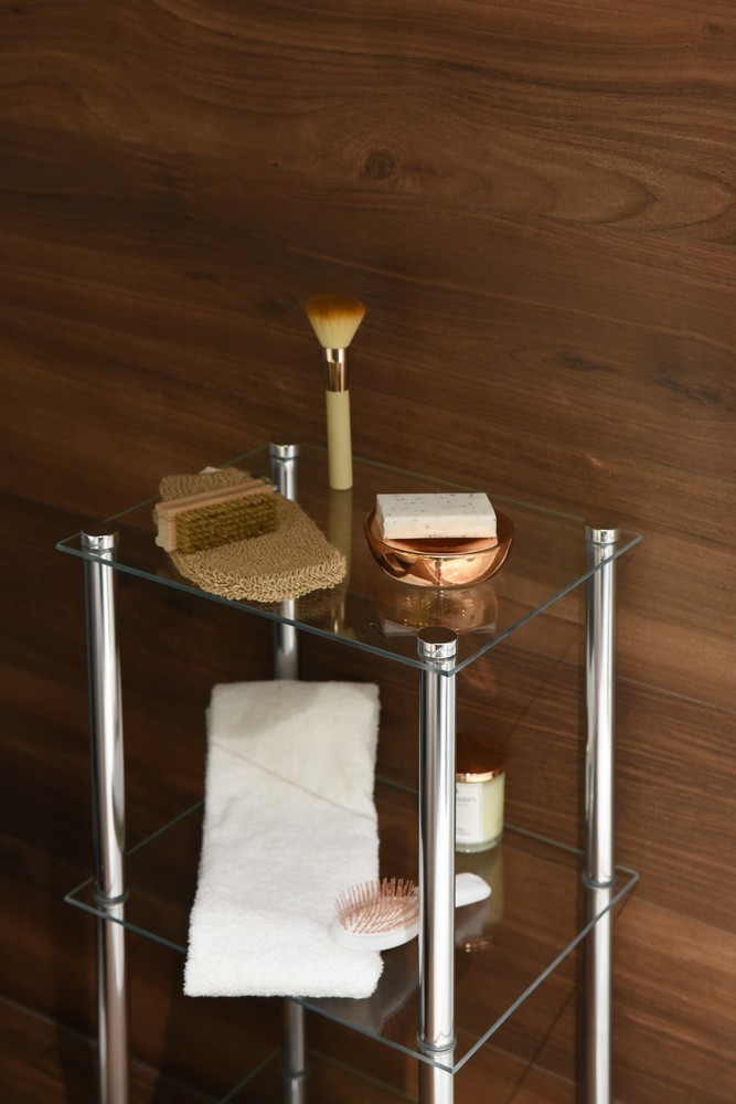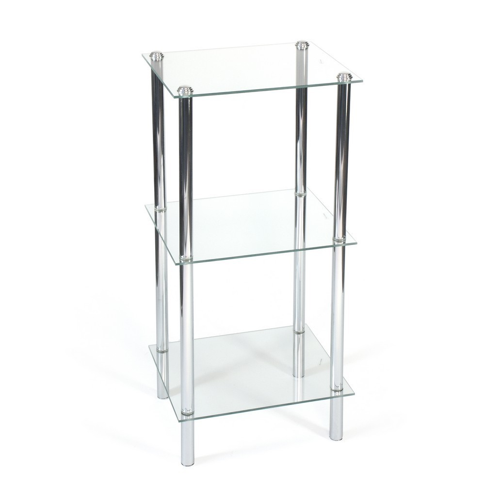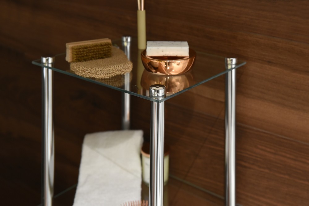 Koupelnová police se třemi skleněnými policemi a rámem z chromované oceli.