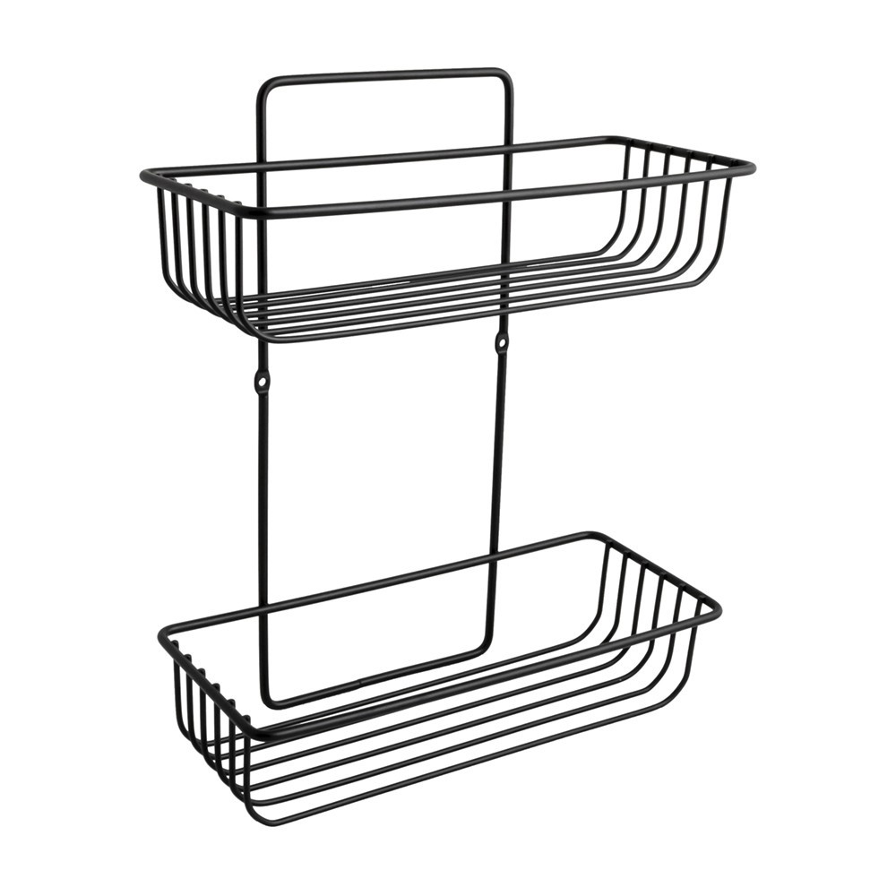 Drátěná koupelnová polička z oceli lakované černě s matným povrchem. Má dva obdélníkové koše na koupelnové doplňky. Montáž pomocí dvou šroubů, které jsou součástí sady.