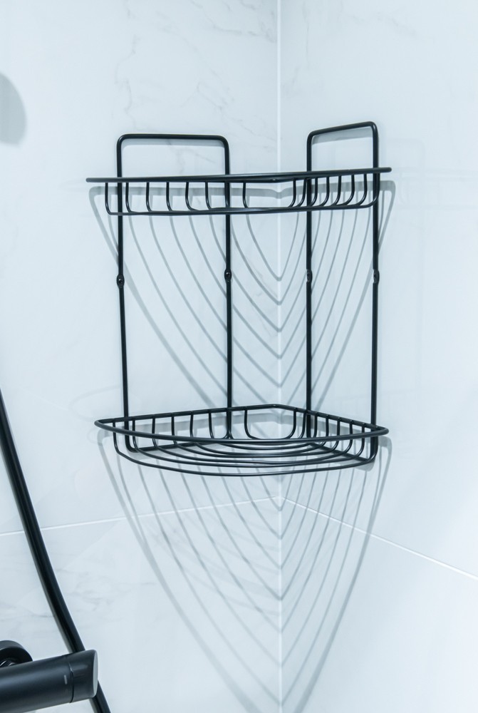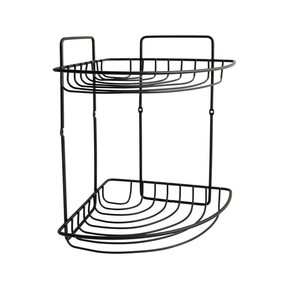 Rohová drátěná koupelnová polička z oceli lakované černě s matným povrchem. Má dva trojúhelníkové koše na koupelnové doplňky. Montáž pomocí dvou šroubů, které jsou součástí sady.