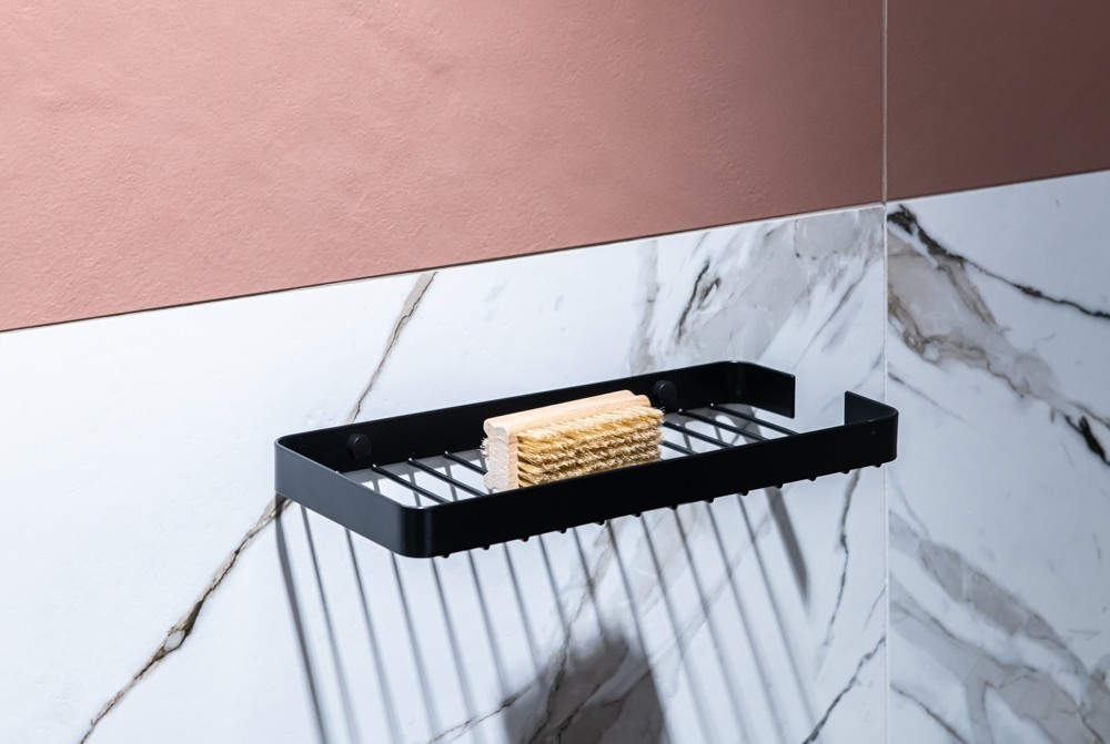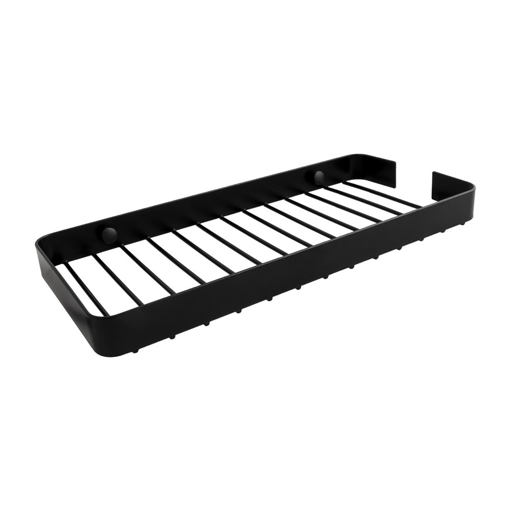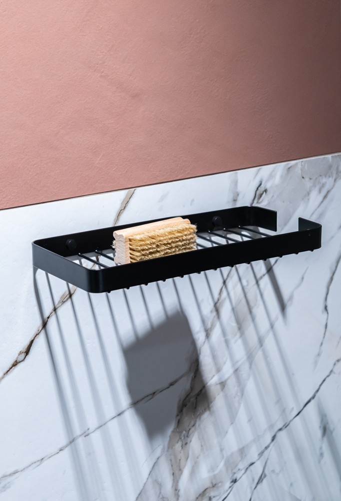 Obdélníková koupelnová polička z masivního drátu v černé barvě s matným povrchem. Koupelnová polička má na boku speciální výřez, díky kterému můžeme zavěsit např. mycí houbu. Montáž se provádí pomocí speciálních šroubů, které jsou zakryty černými plastovými krytkami, aby po montáži nebyly vidět. Vzniká tak velmi estetický a moderní výsledný efekt.