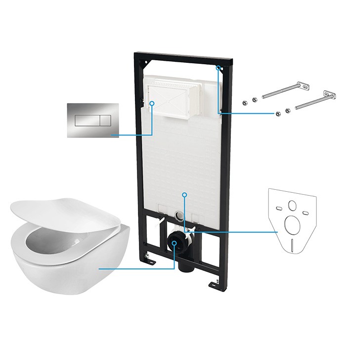 podomítkový modul, závěsná WC mísa, WC sedátko, ovládací tlačítko, akustická podložka, kotevní šrouby