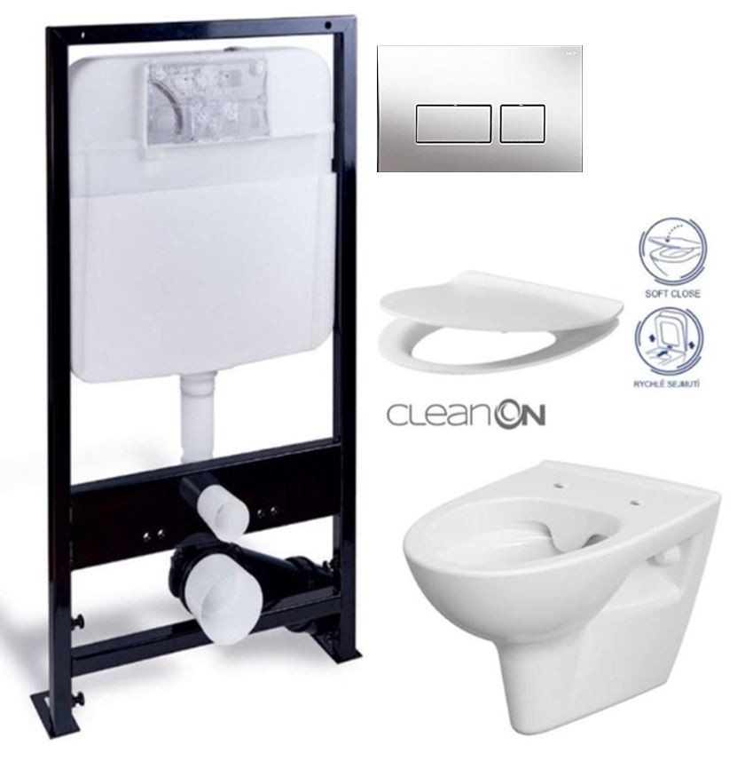 Závěsná mísa PARVA Clean ON elegantního vzhledu s horizontálním odpadem. Funkce splachování 2,5/5, 3/5l.