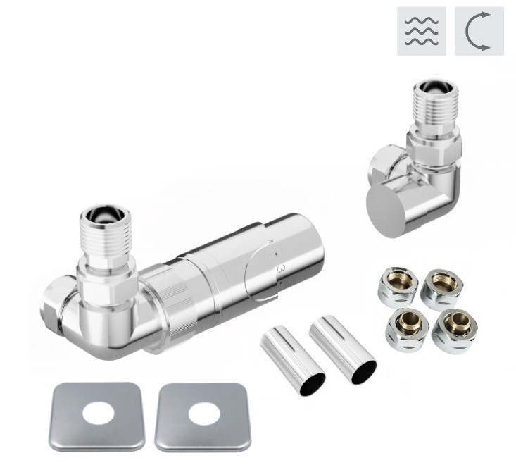 Rohová oboustranná (levá i pravá) termostatická sada PRIME vč. 2 krycích rozet a 2 krycích trubiček (mosaz) je určena pro připojení radiátorů na rozvody TUV s vývodem ze zdi s různou roztečí (krajní - rohové připojení).